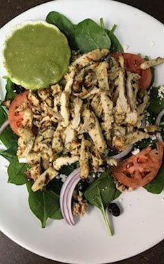 Marinated chicken, carmelized walnuts, dried cranberries, carrots, tomato, red onion & feta cheese over baby spinach. Served with pesto vinaigrette.