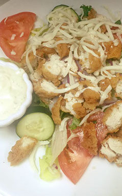 Mixed lettuce topped with chicken fingers, shredded mozzarella, tomato, cucumber & red onion. Served with honey mustard dressing.